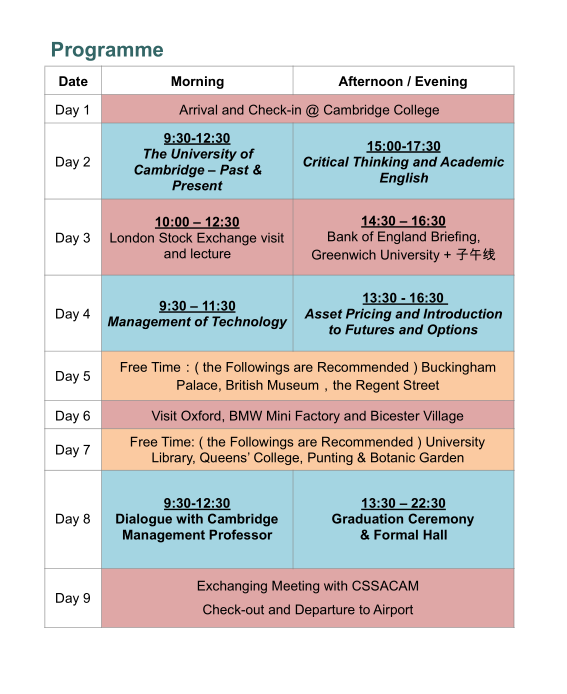 3. 费用包含:剑桥大学师资、教室、住宿、剑桥项目对接老师和相关参访的交通费用。