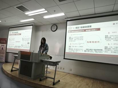紧接着,点评人李林霏同学围绕马斯克的人格解读这一主题,分享了自己的见解。首先,她阐述了自己对于完美主义的感知,探讨了马斯克身上具有的人性光辉与疯狂的综合体;其次,针对商业与社会责任问题,她认为二者可以共存,但可能导致人格的异化;最后她以“他身上有伤痕,有执念,有闪光,也有黑暗。他不是一个普通人,但却最真实地体现了,在边界处探索的人类,究竟可以有多疯狂”总结马斯克的独特人格。
